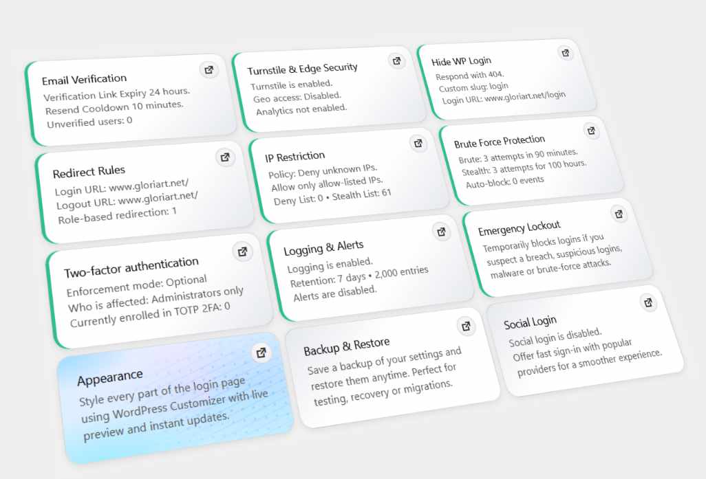 See your security stack like a control center clean cards, clear status, and fast actions. Shows what’s enabled, what’s off, and what needs attention at a glance. Highlights critical items first (lockouts, failed logins, misconfigurations).